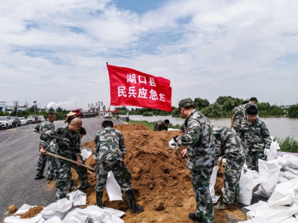 千餘名員工在緊急加固堤壩的同時,方大九鋼按湖口縣人武部的要求,緊急出動企業人武部26名民兵對牛角蕪水庫堤壩再次進行加固。