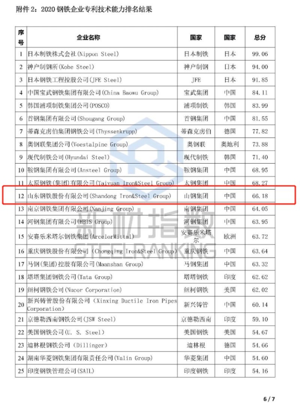 日前,新材指數發布2020世界鋼鐵企業專利技術能力排名,山鋼股份名列世界第12位,中國鋼企排名第5位。本次評選共有50家企業入圍,其中31家中國鋼鐵企業,19家外國鋼鐵企業。