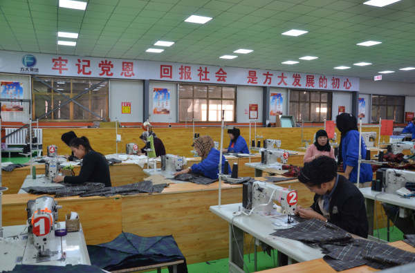 方大九鋼東鄉產業扶貧點——服飾項目車間內,就業群眾正在有序工作