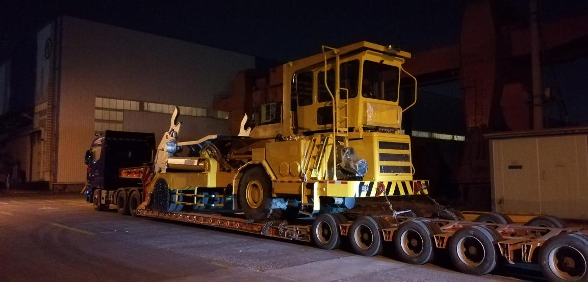 3月9日,中冶寶鋼首次出口非洲加蓬共和國BGC35噸鉸接式A型抱罐車在夜色中順利發貨,最終用戶為莫安達(Moanda)鋼鐵廠。