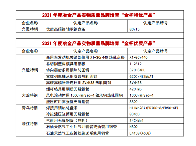 4月6日,在中國鋼鐵工業協會發布的“2021年冶金產品實物質量品牌培育產品”名單中,中信泰富特鋼集團旗下江陰興澄特種鋼鐵有限公司1項產品獲譽2021年度“金杯特優產品”,江陰興澄特種鋼鐵有限公司5項產品、大冶特殊鋼有限公司3項產品、青島特殊鋼鐵有限公司1項產品、靖江特殊鋼有限公司4項產品獲譽2021年度“金杯優質產品”。