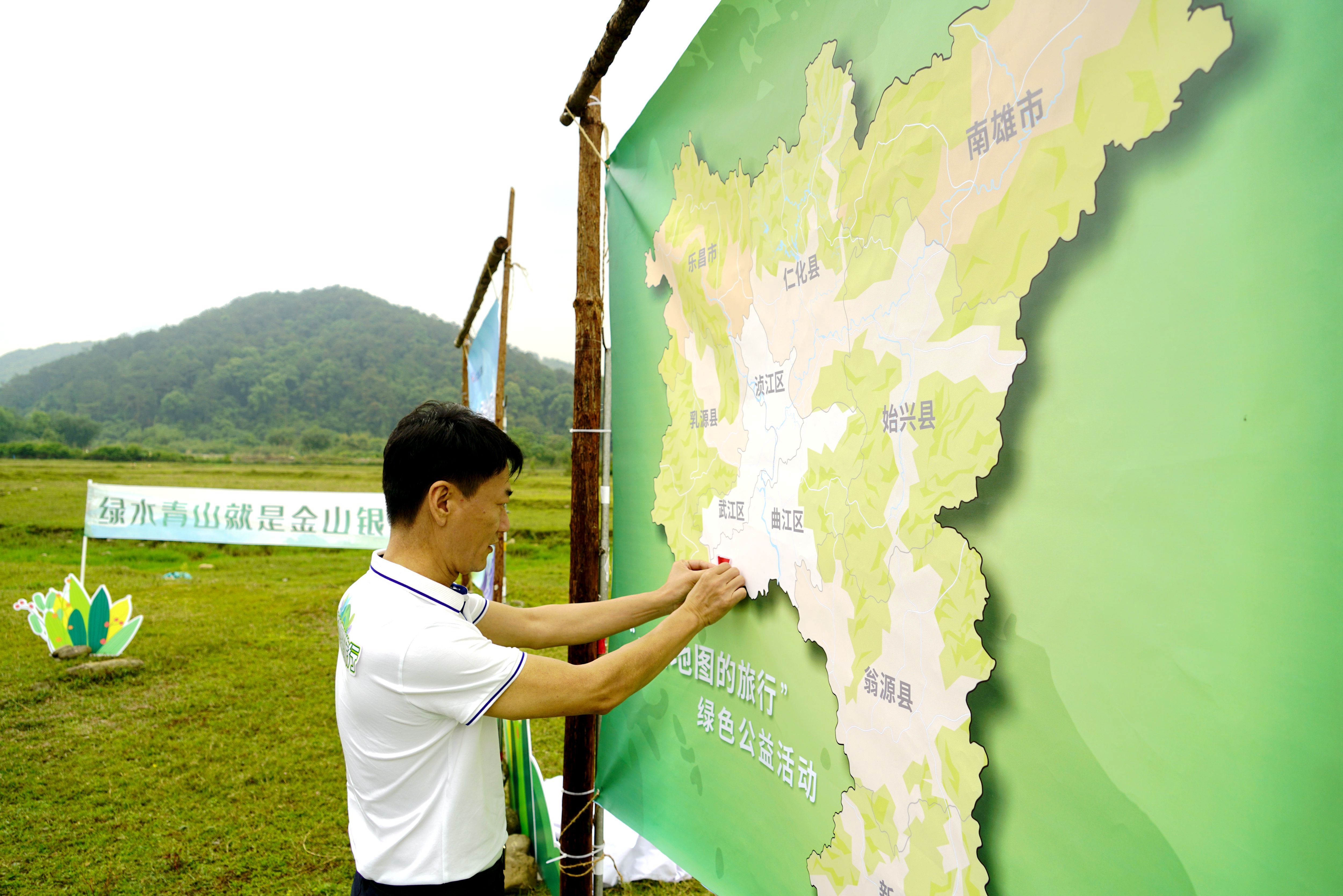 解旗在地圖中的曲江羅坑大草原處貼上小紅旗,拉開韶鋼綠色公益活動的序幕,開啟“一張地圖”的“第一次旅行”