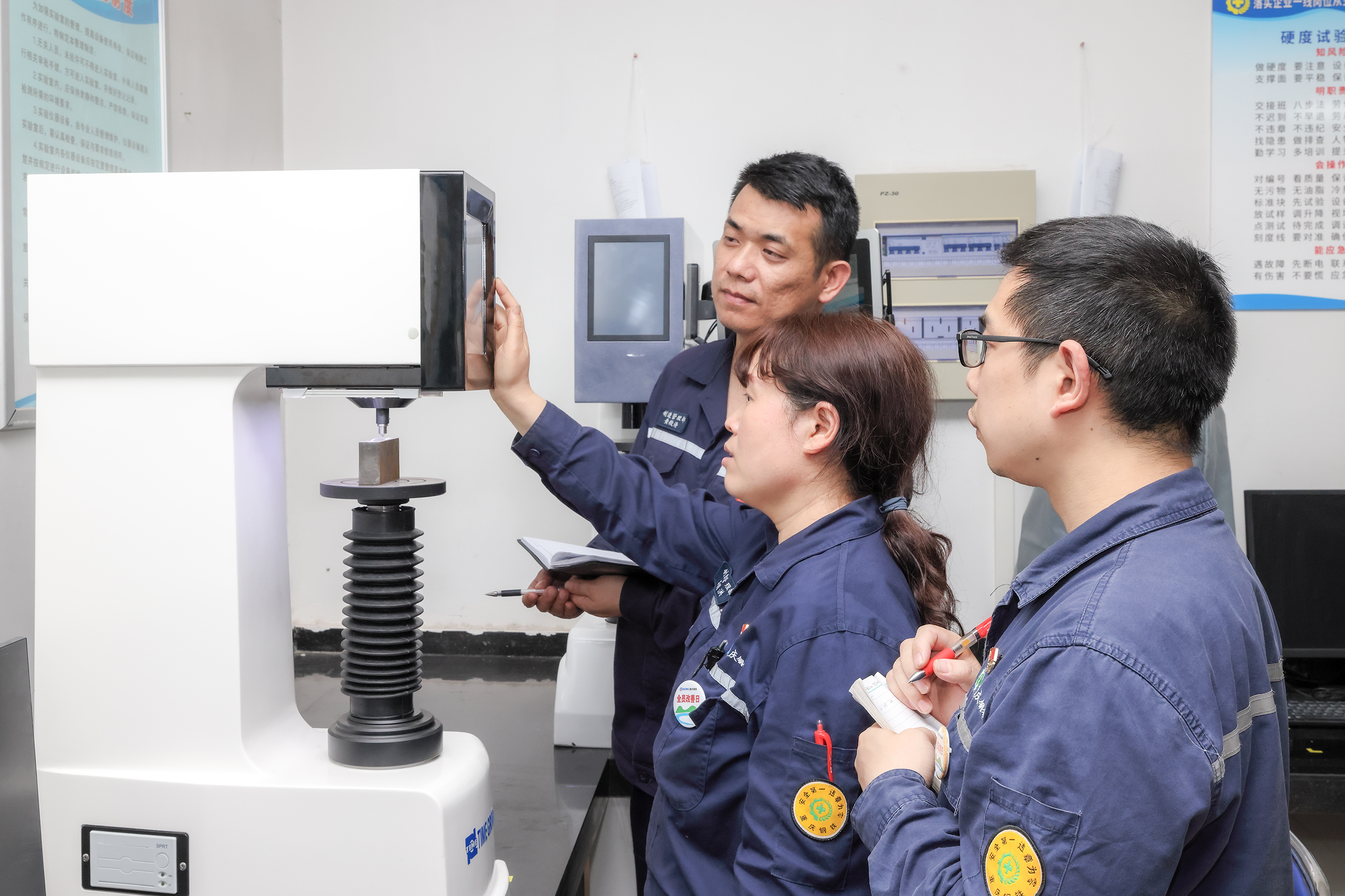為保證向用戶交付出滿意的產品,重慶鋼鐵加強生產過程跟蹤,確保產品質量受控。相關產品研發技術人員全程參與煉鋼、軋zha鋼gang工gong序xu的de生sheng產chan組zu織zhi,根gen據ju實shi際ji情qing況kuang不bu斷duan優you化hua工gong藝yi參can數shu,嚴yan格ge執zhi行xing工gong藝yi製zhi度du和he操cao作zuo標biao準zhun。為wei提ti高gao鋼gang板ban回hui火huo性xing能neng合he格ge率lv,公gong司si對dui軋zha製zhi態tai鋼gang板ban取qu樣yang在zai實shi驗yan室shi進jin行xing回hui火huo摸mo底di實shi驗yan,穩wen定ding洛luo氏shi硬ying度du性xing能neng,並bing將jiang實shi驗yan室shi優you化hua工gong藝yi應ying用yong於yu大da生sheng產chan回hui火huo熱re處chu理li。公gong司si攻gong克ke了le冶ye煉lian過guo程cheng控kong製zhi難nan度du大da、下線吊運困難(Cr元素反鐵磁性)、表麵與心部硬度差異大等多項技術難題,一次試驗成功,合格率100%。