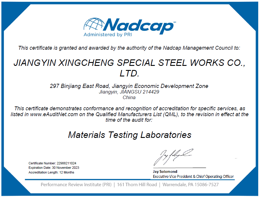 MTL作為興澄特鋼第一個通過特殊工藝認證的國際項目,為下一步開展Nadcap-HT(熱處理)、Nadcap-NDT(無損檢測)及TPG-STL(交通運輸與能源-連鑄)項目積累了寶貴經驗。該證書的獲得,不僅標誌著興澄特鋼質量檢測水平再攀新高,也標誌著興澄特鋼已進入PRI官方的航空供應鏈采購名錄,為興澄特鋼產品進入航空及交通能源領域的高端市場取得了官方通行證。