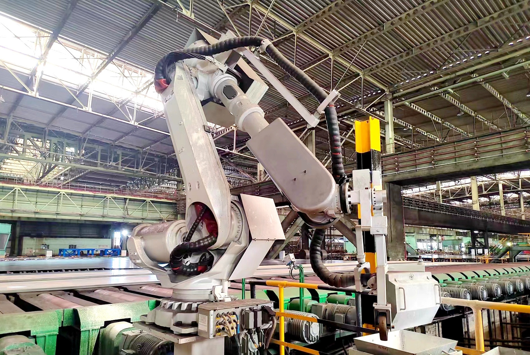 熱噴印機完成升級改造後,采用了工業機器人,可實現高溫鋼板的在線自動標識,標識後下線堆冷,實現全自動化控製,無需人工進行標識,提高了生產的效率,並確保了每件鋼板的信息準確無誤,降低了員工的勞動強度,有效避免了相應的安全隱患。(陳睿)