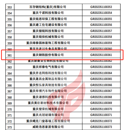 11月7日,全國高新技術企業認定管理工作領導小組辦公室發布《重慶市認定機構2023年認定報備的第一批高新技術企業備案名單》,重慶鋼鐵順利通過2023年“高新技術企業”認證。