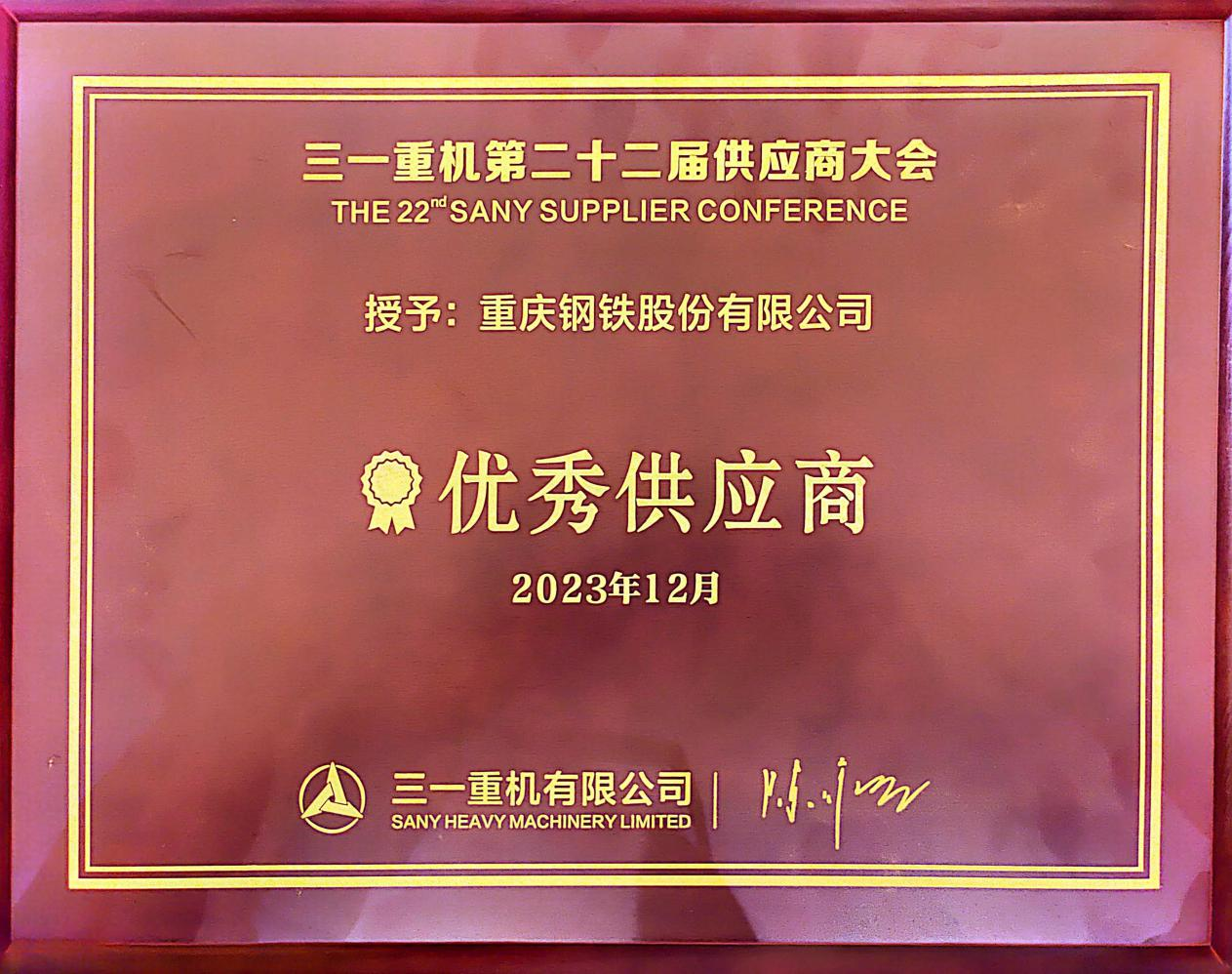 2021年,三一重機(重慶)有限公司投產,重慶鋼鐵憑借堅實的中厚板生產實力、優秀的中厚板產品質量及區位優勢,在三一重機(重慶)有限公司的供應商市場中脫穎而出,成為三一重機(重慶)基地優秀的合作夥伴。2023年12月,三一重機(重慶)有限公司在江蘇昆山召開了2023年度“三一重機第22屆供應商大會”,重慶鋼鐵憑借優秀、高質量的產品和服務,以及良好的品牌口碑和信譽,榮獲三一重機“優秀供應商”稱號。