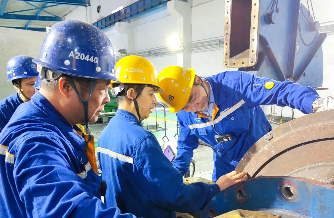 2023年10月,能環部維檢作業區開始緊鑼密鼓四櫃區1號轉爐風機定修。作為本區域旋轉設備協力回歸後的首次定修工作,在線做動平衡過程中風機水平振動值偏高讓工作人員感覺遇到了不小的挑戰。工作人員不斷摸索如何解決風機振動值偏大的辦法。8位師傅一次又一次地將一噸多的風筒上蓋拆除和回裝試機,通過排除法,手拿銼刀一前一後地打磨上蓋與葉輪連接處、根據測試儀的數據,“9°處加19克”,“301°處加68克”,切割合適重量的鋼塊並焊接至葉輪對應角度處為葉輪平衡配重。師傅們連續兩天忙至深夜,第三天上午,設備試機至轉速為2500轉每分鍾時,振動測試儀的讀數終於從第一次試機的20以上下降至0.7,滿足設備運行的振動值1.0以下的要求,師傅們嚴肅的眉間終於舒展開來露出笑容。作業區協力回歸後,雖然大家工作量增加了,但每年能為公司節省110萬元的委外成本。此次通過使用幾千元的清洗劑、鐵塊等耗材,完成了價值20萬元的設備檢修工作。