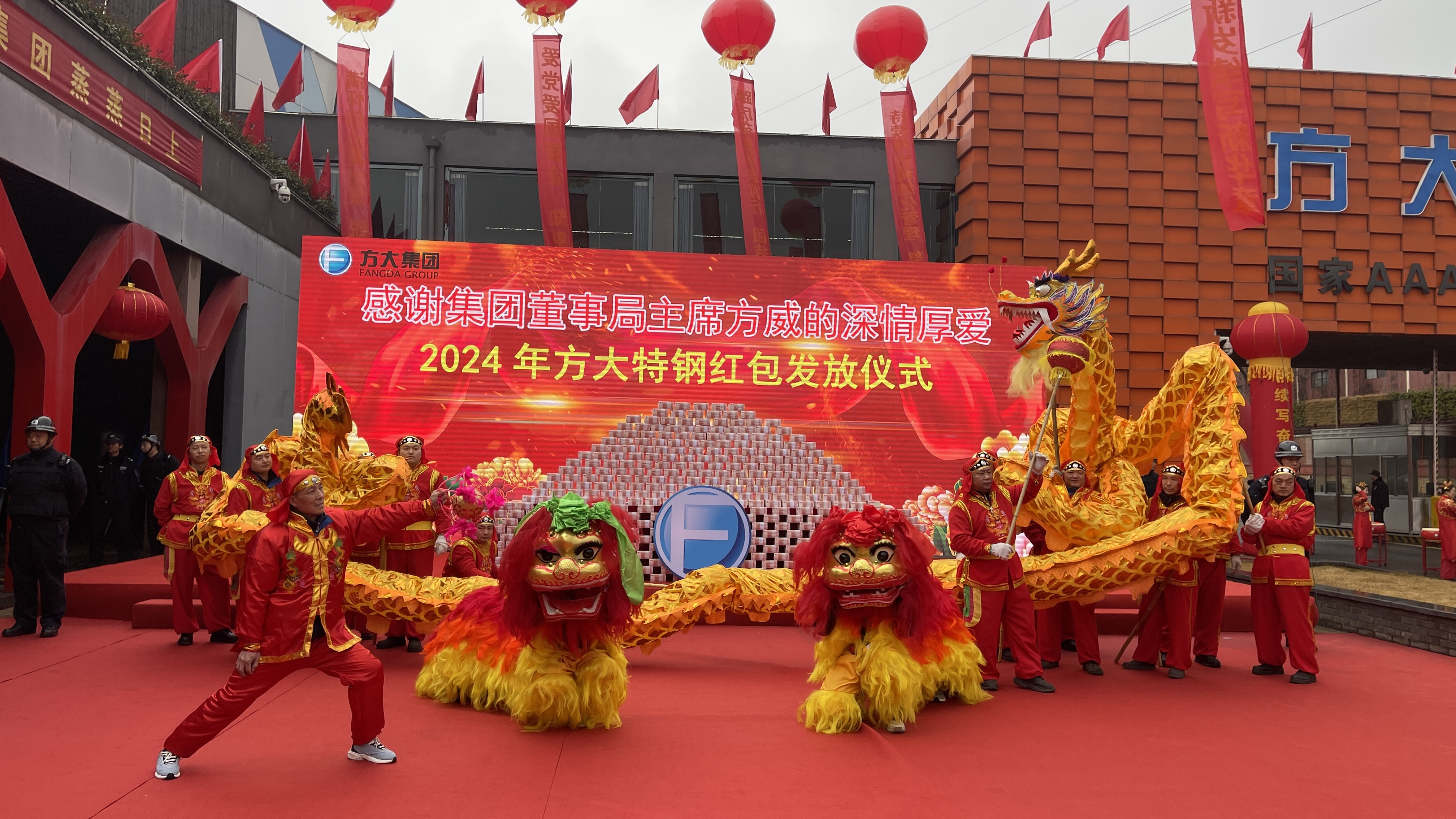 1月30日,方大特鋼舉行紅包發放儀式,現場歡聲笑語、鑼鼓喧天,鋼鐵工人們載歌載舞、舞龍舞獅,空氣中洋溢著濃濃的喜慶氛圍。據統計,方大特鋼改製以來已11次為員工發紅包,紅包總額近12.1億元。