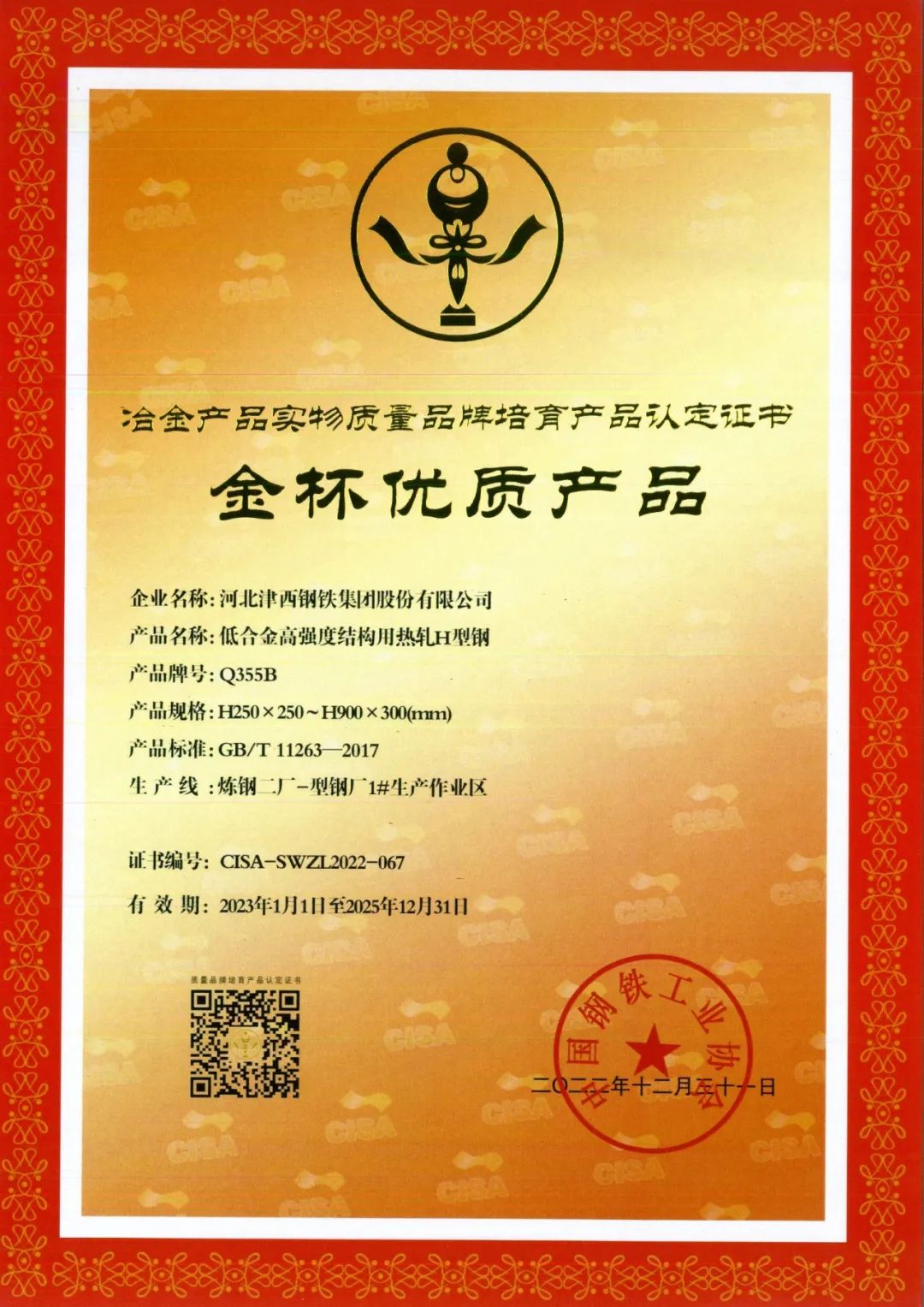 冶金產品實物質量品牌培育活動,由中國鋼鐵工業協會領導和指導,由(you)冶(ye)金(jin)科(ke)技(ji)發(fa)展(zhan)中(zhong)心(xin)負(fu)責(ze)組(zu)織(zhi)實(shi)施(shi),每(mei)年(nian)組(zu)織(zhi)一(yi)次(ci),旨(zhi)在(zai)推(tui)動(dong)產(chan)品(pin)質(zhi)量(liang)的(de)持(chi)續(xu)改(gai)進(jin),加(jia)快(kuai)產(chan)品(pin)升(sheng)級(ji)換(huan)代(dai),提(ti)升(sheng)企(qi)業(ye)質(zhi)量(liang)管(guan)理(li)水(shui)平(ping),增(zeng)強(qiang)企(qi)業(ye)品(pin)牌(pai)培(pei)育(yu)能(neng)力(li),擴(kuo)大(da)企(qi)業(ye)品(pin)牌(pai)影(ying)響(xiang)力(li),有(you)利(li)於(yu)向(xiang)下(xia)遊(you)用(yong)戶(hu)推(tui)介(jie)品(pin)牌(pai)產(chan)品(pin),幫(bang)助(zhu)企(qi)業(ye)提(ti)升(sheng)產(chan)品(pin)品(pin)牌(pai)價(jia)值(zhi)和(he)市(shi)場(chang)競(jing)爭(zheng)力(li)。通(tong)過(guo)審(shen)定(ding)委(wei)員(yuan)會(hui)審(shen)定(ding)的(de)產(chan)品(pin),冠(guan)名(ming)為(wei)“金杯優質產品”稱號,有效期為三年。