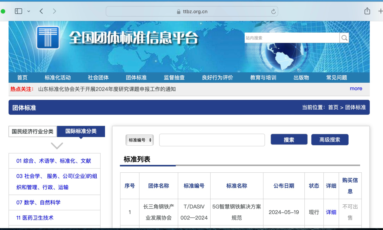 該標準編號:T/DASIV 002-2024 ;名稱:《5G智慧鋼鐵解決方案規範》;2024年5月19日發布,2024年5月20日實施。