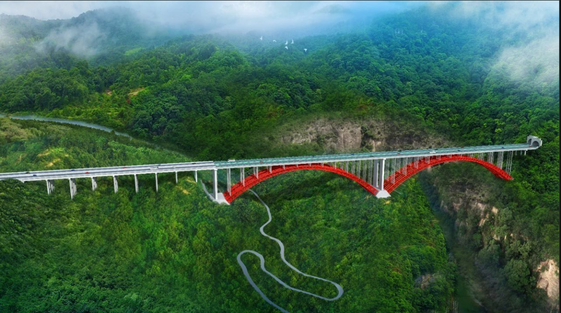 大橋橫跨六車河峽穀,橋麵至穀底相對高差約489.5m。六車河特大橋主橋為2X263.5m雙聯上承式鋼管混凝土變截麵桁架拱橋,拱座采用樁基礎或擴大基礎。主橋主拱圈劃分為92個節段,最大節段吊裝重量約為160.0t。