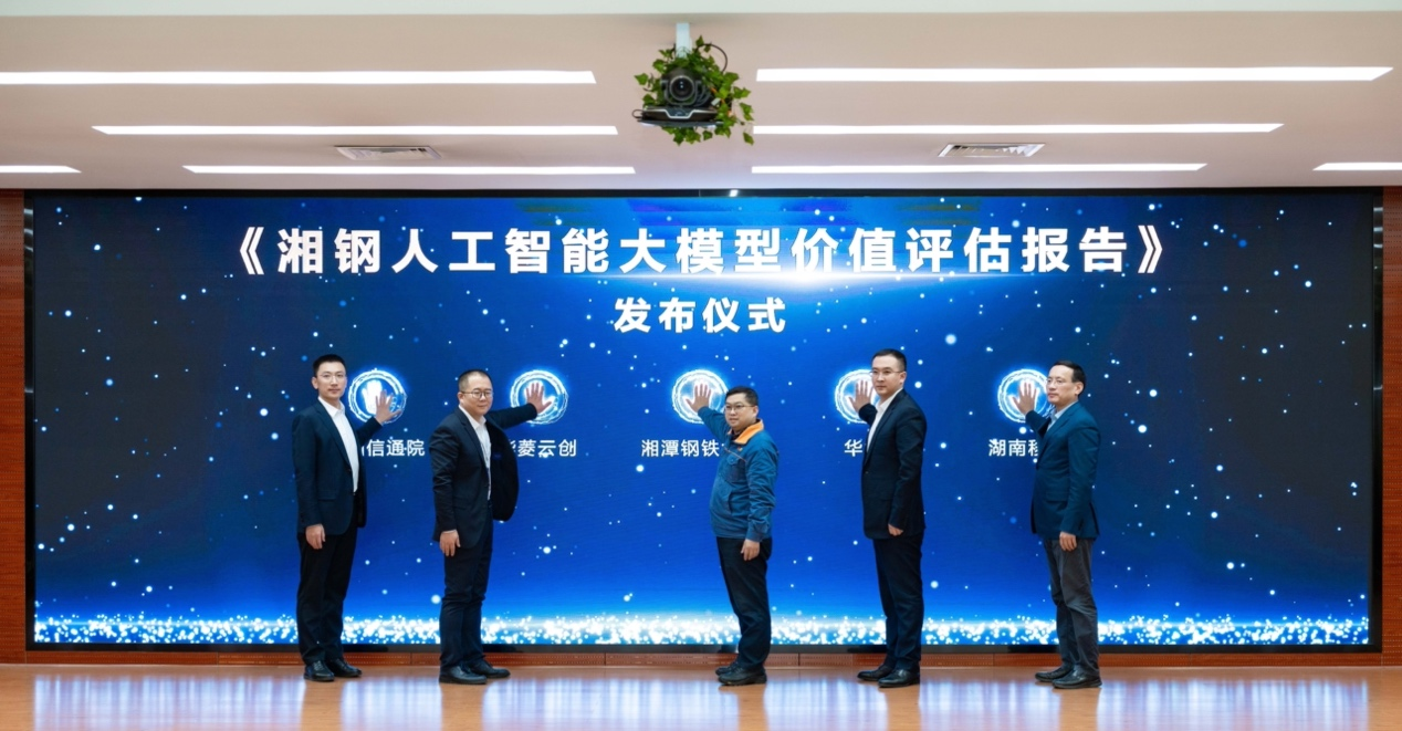 研討會上,湘潭鋼鐵集團有限公司黨委書記、執行董事、總經理楊建華,湖南華菱雲創數智科技有限公司黨委書記、執行董事夏時謙,華為主機上雲軍團CEO、混合雲總裁尚海峰,中國信通院雲大所雲計算部主任馬飛以及中國移動通信集團湖南有限公司副總經理張坤出席並聯合發布《湘鋼人工智能大模型價值評估報告》,依照中國信通院評估模型結合湘鋼人工智能大模型應用效果開展論證,深入探尋了鋼鐵產業智能化的路徑、方法和實踐。