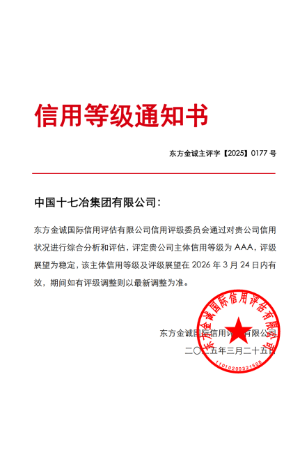 近日,中國十七冶獲得東方金誠國際信用評估有限公司主體信用評級AAA級,評級展望為穩定。這是繼2024年獲得中誠信國際信用AAA評級之後,再次斬獲國內權威信用評級機構的最高等級認可,正式邁入主體信用雙AAA評級新時代,為該公司加快打造“全國一流、行業領先的工業化、數字化、綠色化、智能化建築運營服務商”提供了強有力的發展支撐。