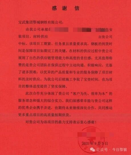 誠cheng信xin是shi企qi業ye的de立li身shen之zhi本ben,擔dan當dang是shi國guo企qi的de應ying有you之zhi義yi。錦jin旗qi和he感gan謝xie信xin不bu僅jin是shi對dui鄂e鋼gang保bao供gong工gong作zuo的de肯ken定ding,更geng是shi對dui鄂e鋼gang誠cheng信xin文wen化hua建jian設she成cheng果guo的de認ren可ke。如ru今jin,鄂e鋼gang已yi將jiang保bao供gong經jing驗yan轉zhuan化hua為wei長chang效xiao機ji製zhi,進jin一yi步bu完wan善shan了le應ying急ji保bao供gong體ti係xi,提ti升sheng了le服fu務wu質zhi量liang水shui平ping,為wei繼ji續xu服fu務wu國guo家jia重zhong點dian工gong程cheng項xiang目mu奠dian定ding堅jian實shi基ji礎chu。(潘苗)