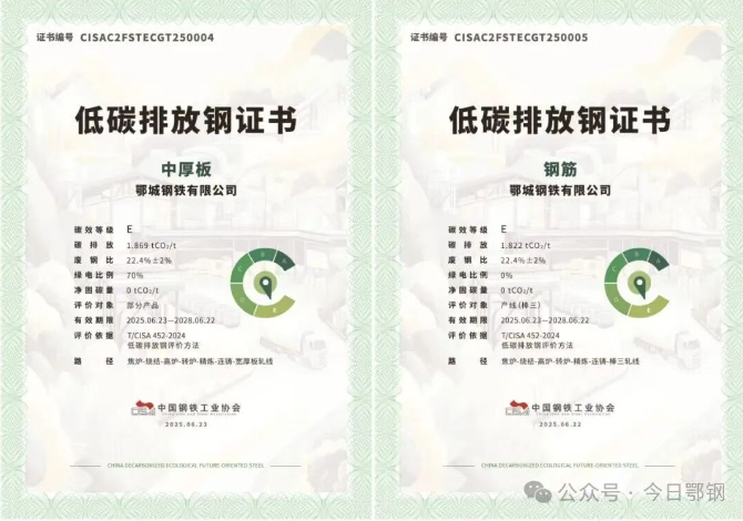 鄂鋼積極構建全流程綠色製造體係、碳管理體係,成功創建國家“綠色工廠”“高新技術企業”,通過工藝技術創新和全流程精益碳管理,噸鋼碳排放強度優於行業平均水平,全工序展現讓能耗數據“說話”的低碳智慧,厚板、鋼筋等產線榮獲中鋼協碳效等級E級認證。