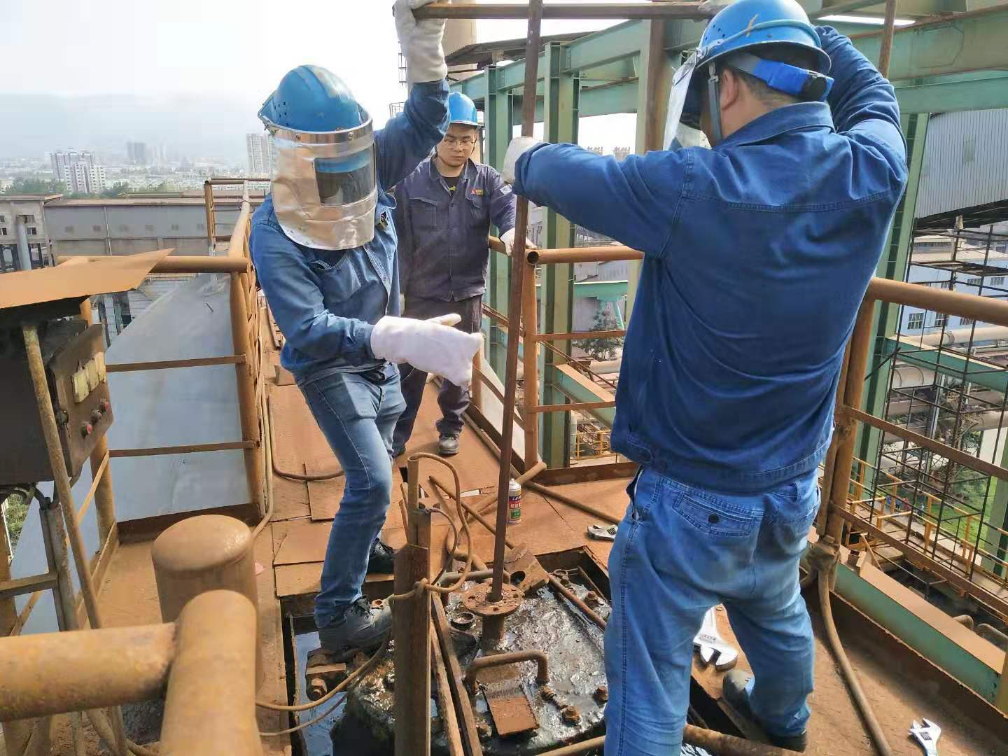 煉鐵工段3人檢修組站在65℃的鐵架板上,正在清理熱風爐拱頂測溫儀管道。管道中不時有溫度向上躥升,戴好麵罩操作,又酷又安全。