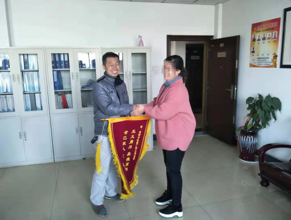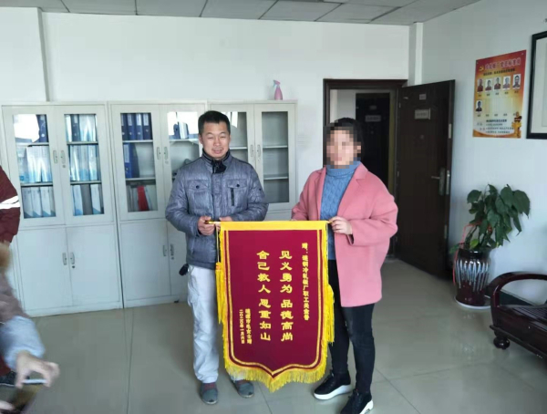 這是2020年1月8日上午9:30,在華菱漣鋼冷軋板廠綜合科辦公室裏筆者看到落水女青年劉某的母親毛女士贈送錦旗給“救人英雄”關金普時的場景。