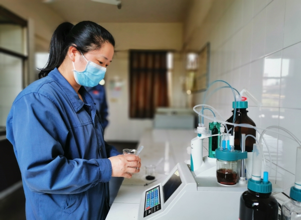 圖為化驗女工在對原燃料進行分析時情景。(張俊攝)