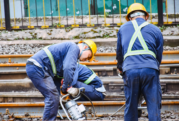 圖為廠內鐵路工人正在對鐵軌進行搗固