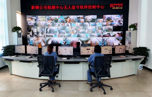 圖為檢測中心無人值守取樣控製中心的職工在監控畫麵時情景