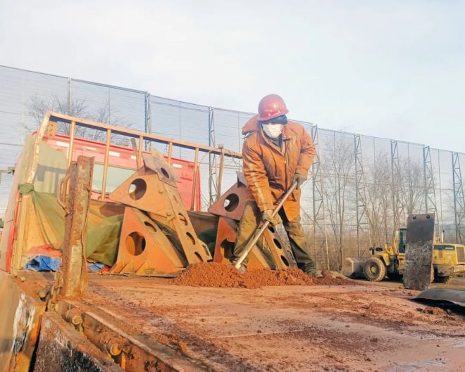 說(shuo)話(hua)間(jian),又(you)一(yi)輛(liang)重(zhong)型(xing)牽(qian)引(yin)半(ban)掛(gua)車(che)駛(shi)入(ru)料(liao)場(chang),隻(zhi)見(jian)曹(cao)秀(xiu)雲(yun)帶(dai)領(ling)班(ban)組(zu)成(cheng)員(yuan)快(kuai)步(bu)走(zou)到(dao)車(che)邊(bian),準(zhun)備(bei)用(yong)工(gong)具(ju)先(xian)把(ba)車(che)廂(xiang)板(ban)放(fang)下(xia)來(lai)。天(tian)寒(han)地(di)凍(dong),即(ji)使(shi)是(shi)這(zhe)樣(yang)簡(jian)單(dan)的(de)操(cao)作(zuo)也(ye)難(nan)以(yi)實(shi)現(xian),車(che)廂(xiang)板(ban)與(yu)礦(kuang)粉(fen)死(si)死(si)地(di)凍(dong)在(zai)一(yi)起(qi),根(gen)本(ben)無(wu)法(fa)放(fang)下(xia)來(lai)。曹(cao)秀(xiu)雲(yun)隻(zhi)能(neng)用(yong)隨(sui)手(shou)攜(xie)帶(dai)的(de)錘(chui)子(zi)對(dui)著(zhe)厚(hou)厚(hou)的(de)冰(bing)柱(zhu)錘(chui)打(da),待(dai)冰(bing)柱(zhu)逐(zhu)漸(jian)散(san)開(kai)後(hou),才(cai)能(neng)把(ba)車(che)廂(xiang)板(ban)放(fang)下(xia),等(deng)到(dao)設(she)備(bei)把(ba)一(yi)車(che)的(de)礦(kuang)粉(fen)卸(xie)下(xia)來(lai)後(hou),曹(cao)秀(xiu)雲(yun)和(he)工(gong)友(you)們(men)爬(pa)上(shang)車(che),開(kai)始(shi)進(jin)行(xing)車(che)底(di)清(qing)理(li)。