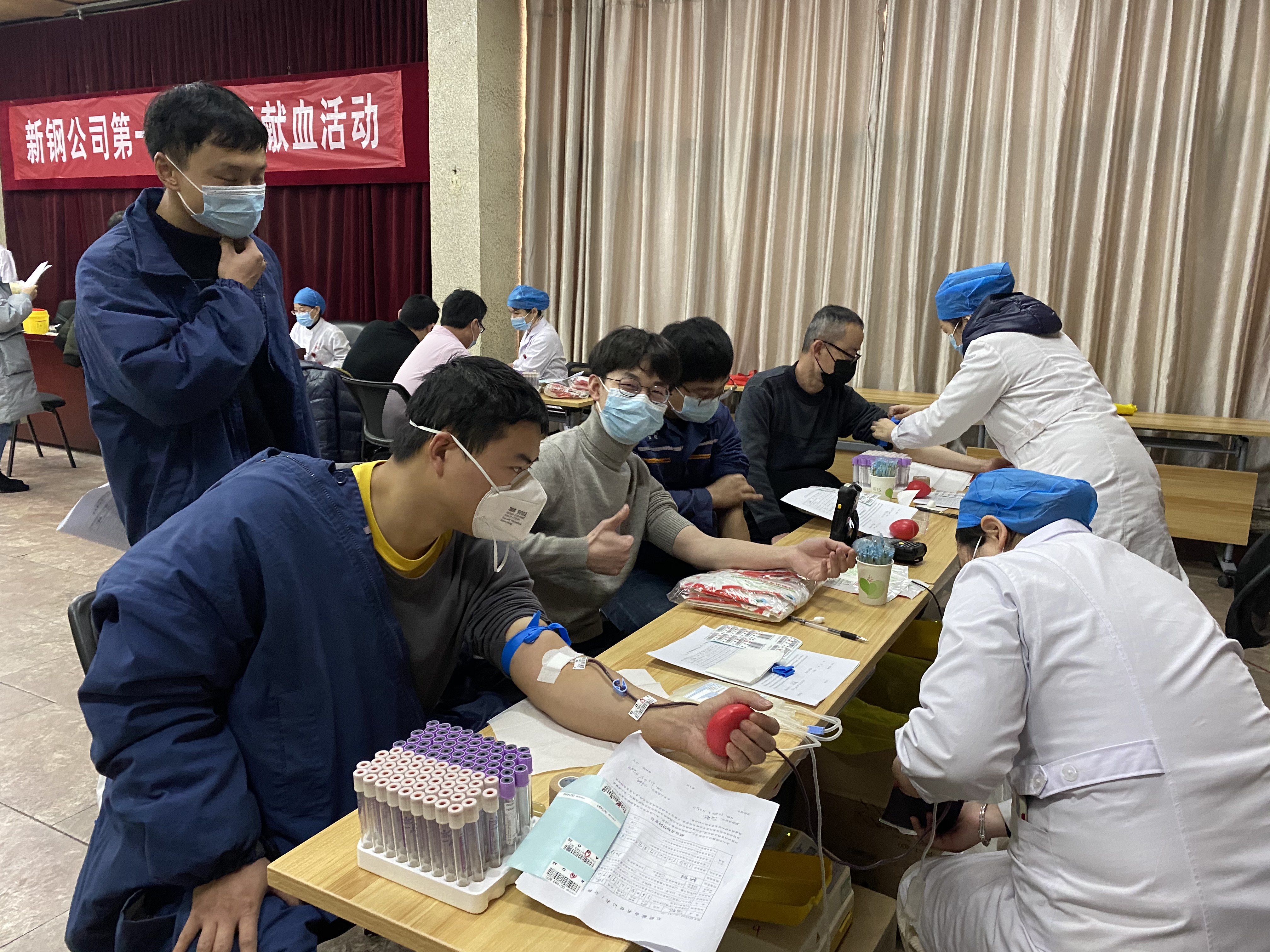 為了緩解血站供血不足的難題,2月25日,新餘鋼鐵集團有限公司工會一片區組織開展職工無償獻血活動,得到檢測中心、良山事業部、中心醫院等11家單位數百名幹部職工的積極響應。圖為該公司檢測中心環境監測大班煙氣檢測班大學生劉文睿(圖中)一次性獻了400cc,麵對鏡頭調皮地豎起了大拇指。(張俊 宋鑫潮)