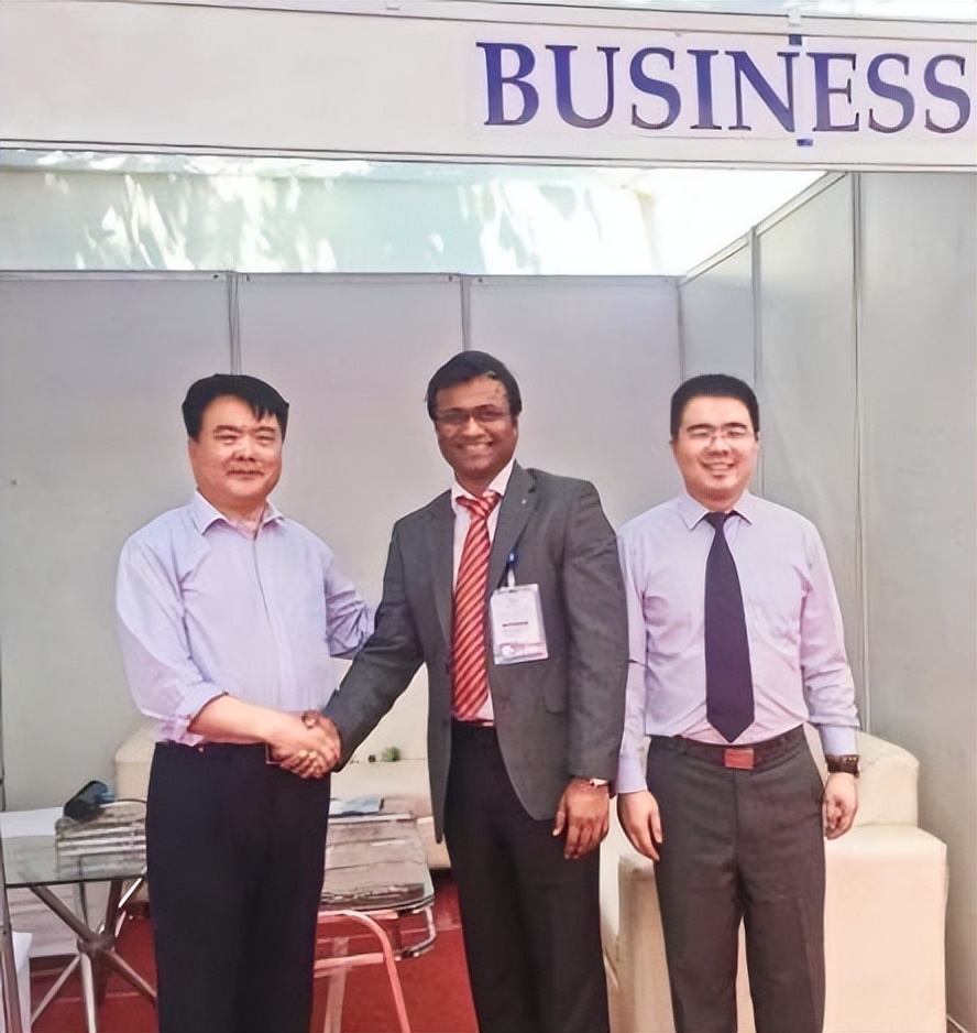 在國際冶金工業展覽會上與外賓合影。左為豫興公司董事長劉世聚,右為豫興公司總經理劉力銘