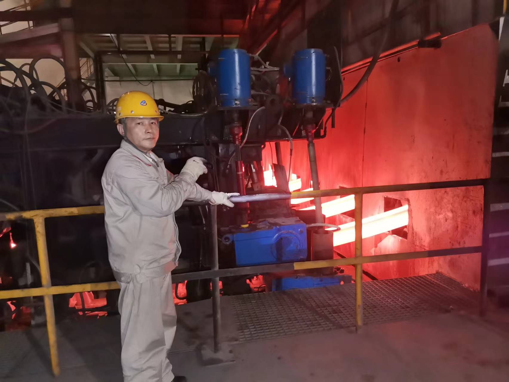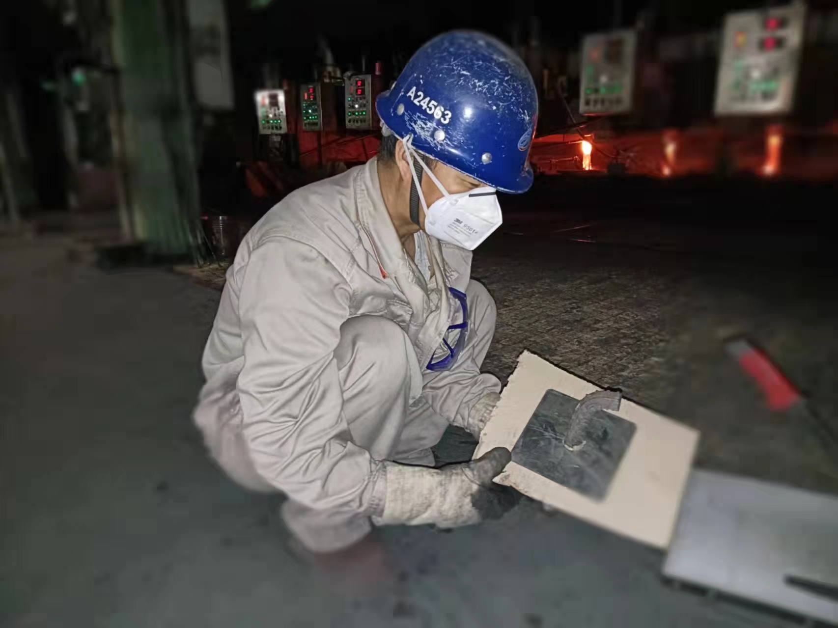 在創新試驗開澆期間,林淡群或蹲在結晶器旁,認真地觀察鋼水注入結晶器時迸發出的火苗;或蹲守在台下拉矯機前端,耐心地等待各引錠杆緩緩牽出火紅的鑄坯;或在拉矯機脫頭輥前不懼高溫觀摩鑄坯脫離引錠頭順利出坯;或在切廢堆仔細研究坯頭與引錠鉤的結合情況。通過不斷總結優化改善方法,成功研製出氧化鐵皮加紙皮替代石棉繩加鐵屑輔助開澆方法,並推廣至其他小方坯連鑄機操作。