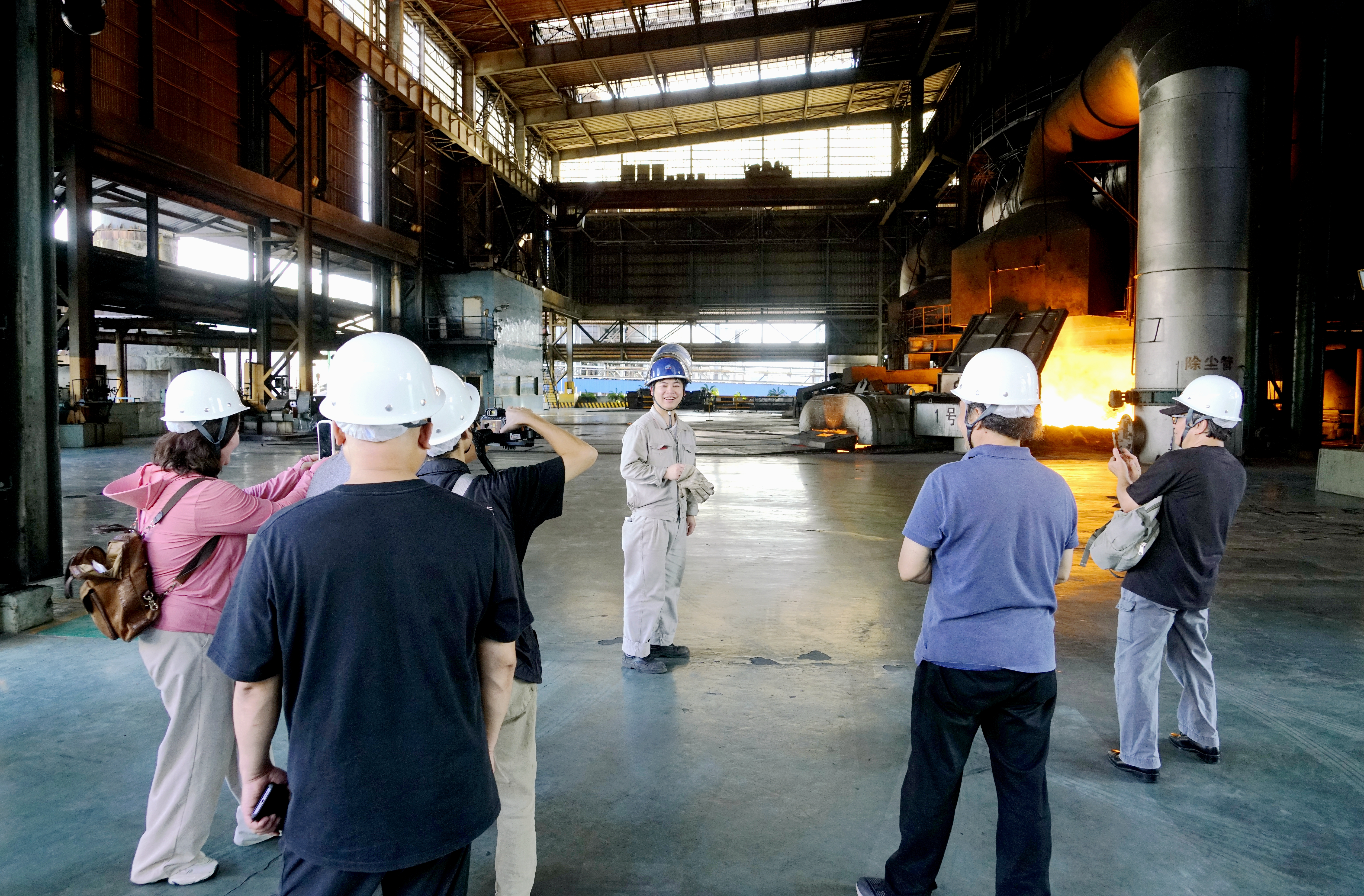 在煉鐵廠8號高爐爐台,藝術家們親身感受了爐台火熱的生產現場,直觀感悟“鋼鐵是怎樣煉成的”,大家紛紛將鏡頭對準熊熊爐火、奔流鐵水。現場員工的吃苦耐勞、自信樂觀、愛企如家等精神品格給藝術家們留下深刻印象,他們紛紛給現場員工拍照或與員工進行合影。