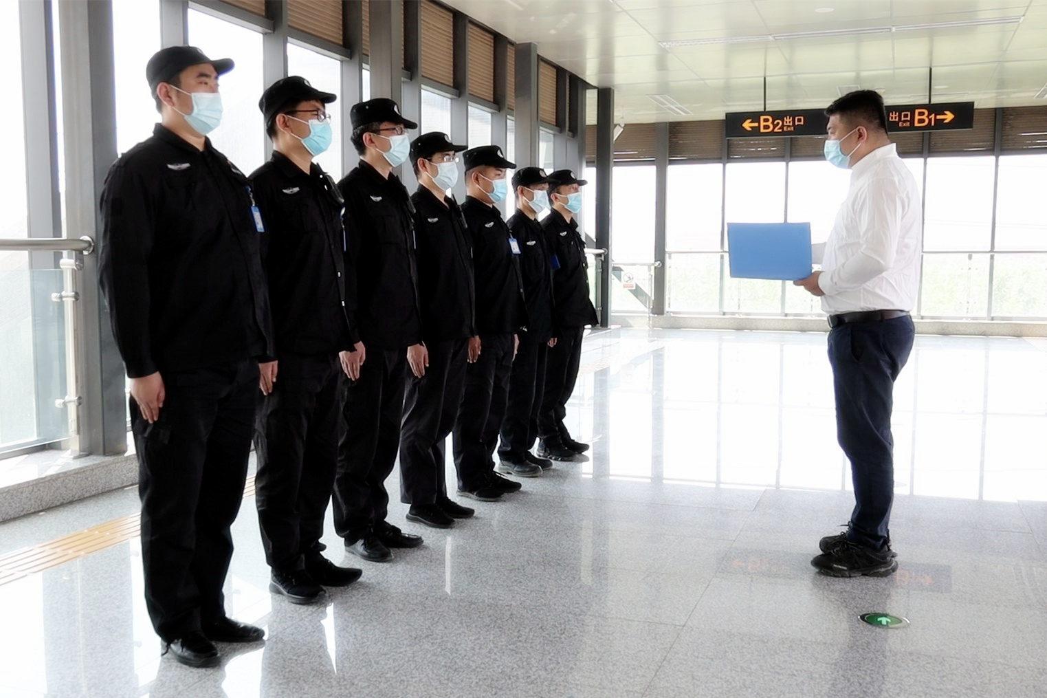 “同誌們,又一輪疫情氣勢洶洶,今天天氣比較炎熱,希望你們能夠克服困難,按照班前會的安排,穿戴好防護服、手套、護目鏡和N95口罩,要全副武裝,注意乘客攜帶的違禁品。記住!站在這裏,就是戰士!現在上崗!”伴隨著薑偉的一聲口令,抗擊疫情安檢員住站的“衝鋒號”吹響。