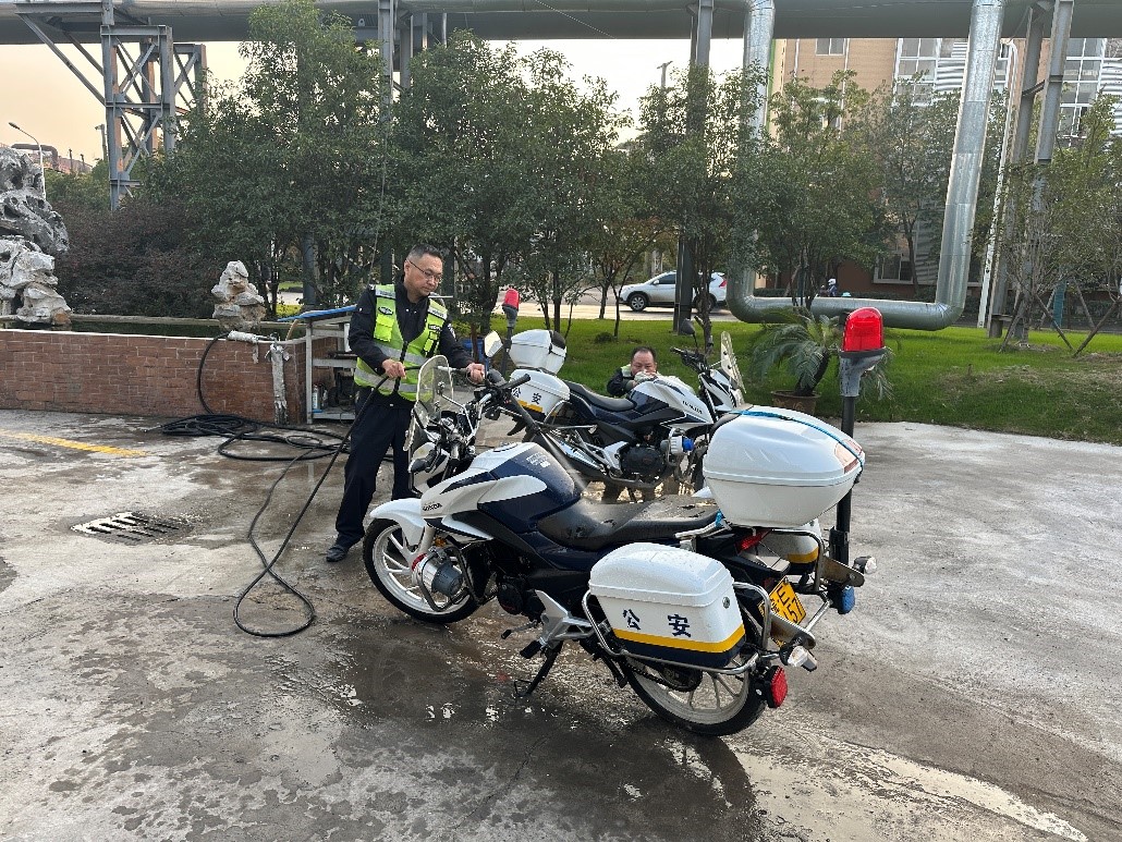 圖為隊員交班前清洗車輛,保證摩托車的整潔
