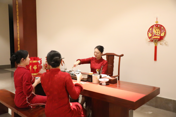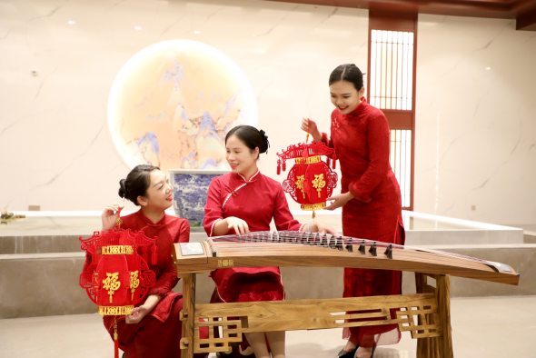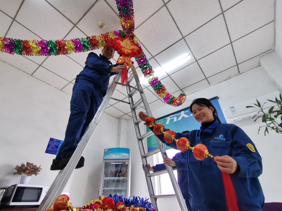 在方大特鋼招待所,工作人員開心地將一個個紅燈籠、“福”字吊墜懸掛在大廳及走道周圍,一派喜慶與紅火,大家品著茶、彈著琴,訴說著新年的願望,一起迎接新年的到來;在焦化廠煉焦車間幹熄焦作業區乙班,班組成員們用“福”字窗花、彩帶裝飾班組,讓小“家”溫馨而喜慶,呈現嶄新的麵貌。