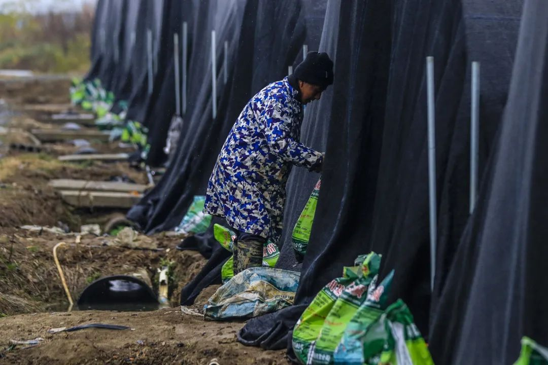 就業的脫貧戶正在為大棚加蓋保溫膜