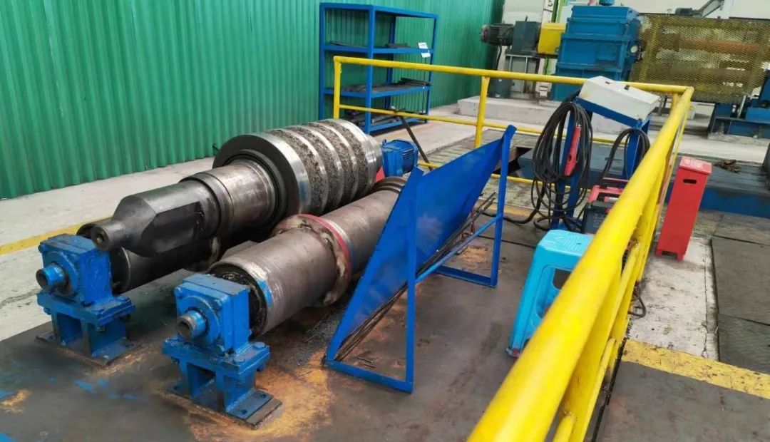 如何達到在軋輥表麵均勻點焊的效果呢?通過不斷對標找差學習取經,開展攻關小組“頭腦風暴”,決定利用廢舊地輥自行設計底座,地輥帶動軋輥旋轉同時進行打點焊滿足均勻布點的效果,同時,結合軋鋼廠軋輥孔型特點,在地輥上加裝定距套,利於不同輥型打點焊。