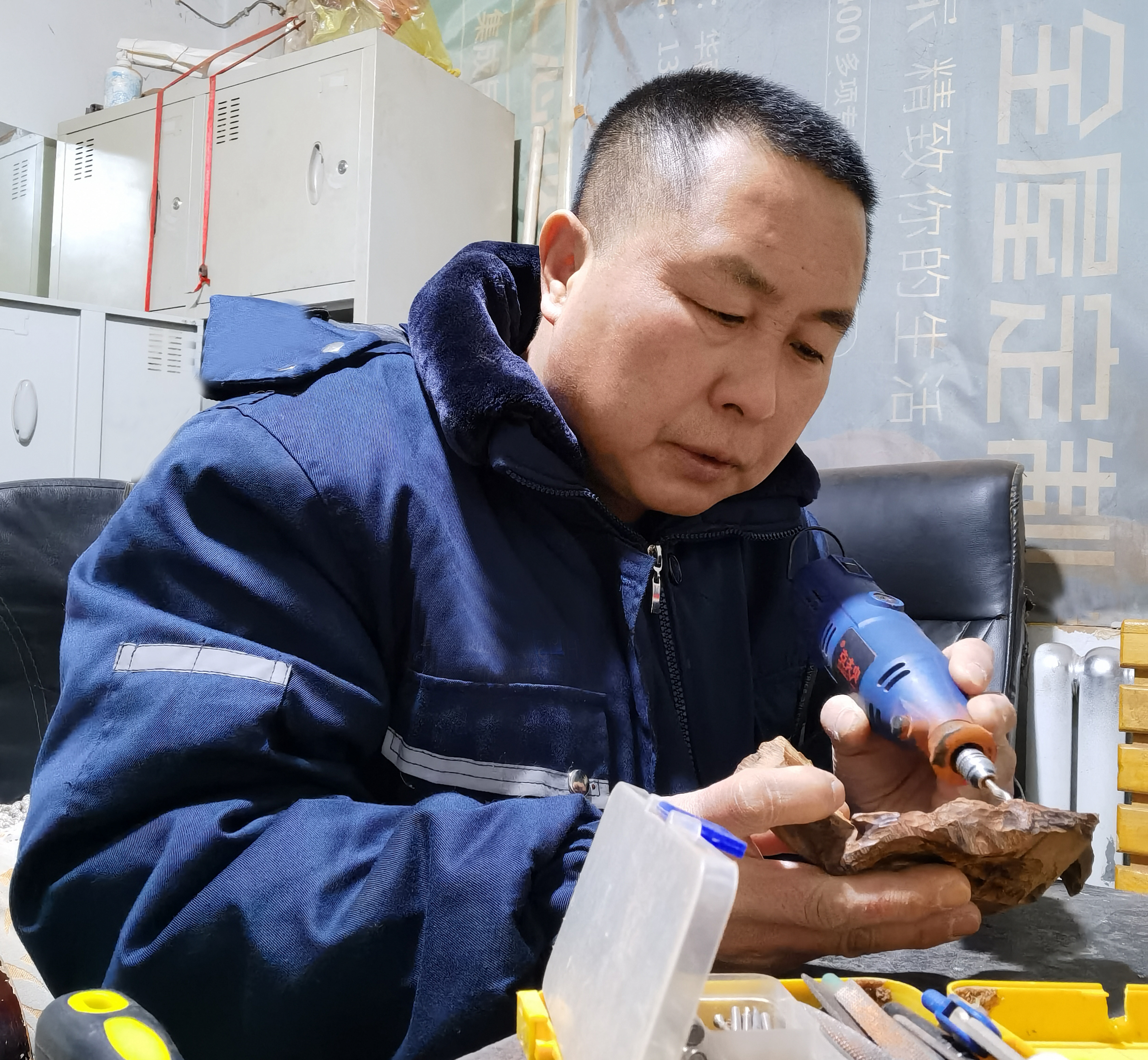 此ci外wai,張zhang師shi傅fu在zai專zhuan心xin致zhi力li作zuo品pin創chuang作zuo的de同tong時shi,還hai喜xi歡huan與yu有you樂le於yu根gen雕diao創chuang作zuo的de人ren進jin行xing交jiao流liu,在zai他ta所suo居ju住zhu的de小xiao區qu裏li也ye有you好hao幾ji個ge退tui休xiu職zhi工gong喜xi歡huan根gen雕diao創chuang作zuo,大da家jia有you著zhe同tong樣yang的de興xing趣qu愛ai好hao,時shi常chang在zai一yi起qi因yin為wei一yi件jian樹shu根gen到dao底di是shi雕diao成cheng什shen麼me而爭的“麵紅耳赤”。小區物業得知有這麼一群根雕愛好者,特意給他們提供出一間房子,為此他們幾名“老夥計”也有了自己的工作室,取名“根藝店”,這些有著相同興趣的愛好者,手裏的刻刀、打磨器、鋸子時常在“根藝店”裏傳出動聽的“旋律”。