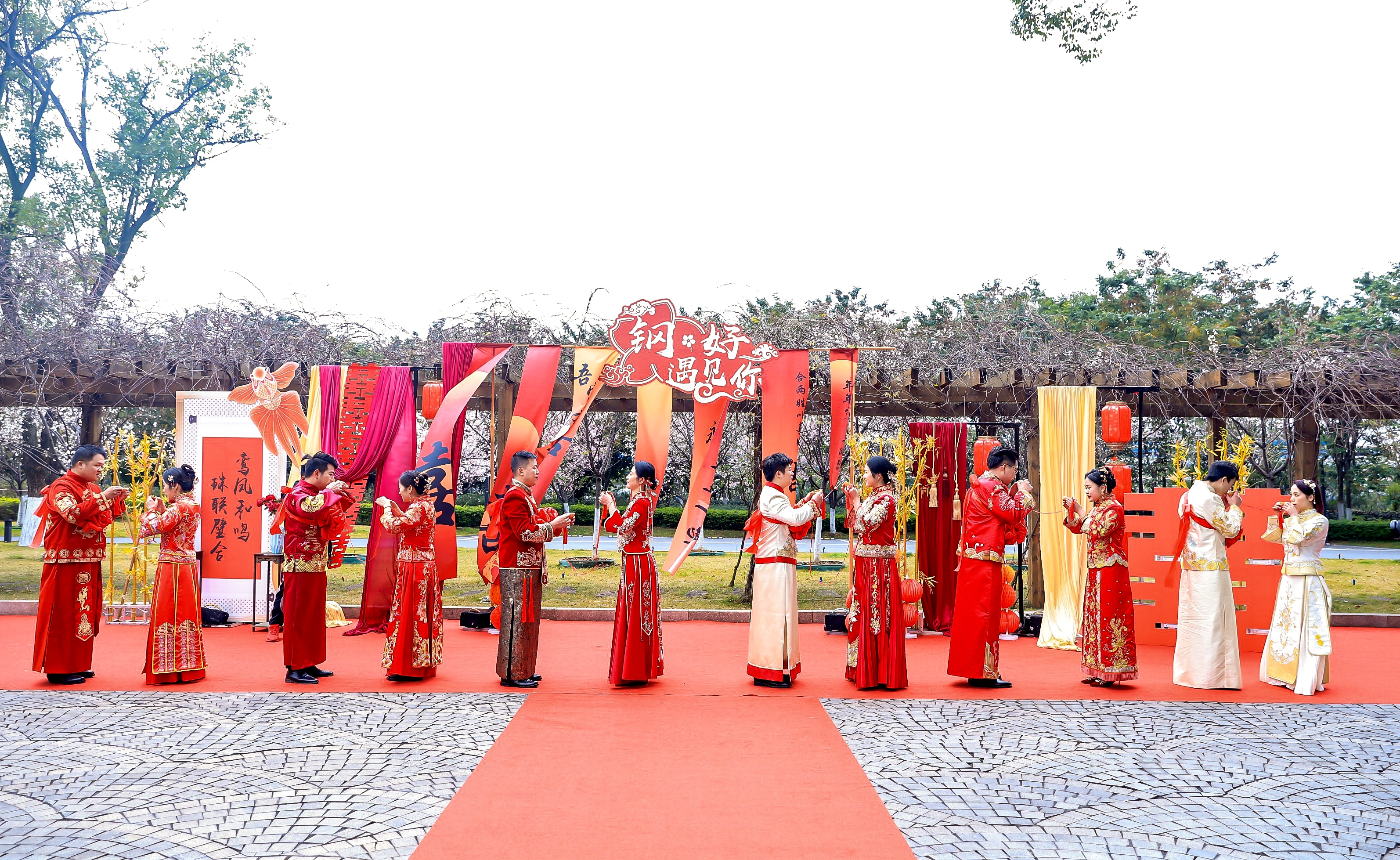 2月24日農曆正月十五元宵節,中南股份“春風裏-第二屆多彩韶鋼漫步文化活動”之“‘鋼·好’遇見你”-集體婚禮在717小鎮舉行。六對新人及四對鋼婚、鐵婚夫婦,在現場觀眾和親友的見證下,身著中式傳統禮服,從兩旁都是櫻花盛開的“甜愛路”緩緩入場,中南股份領導與各單位黨政負責人為每一對夫婦送上一對同心結,真摯地祝願他們百年好合、永結同心。在司儀的引導下,一係列傳統婚俗禮儀讓一對對新人幸福感、獲得感、歸屬感爆棚。“願得一人心,白頭不相離;執子之手,與子偕老。”他們因鋼鐵事業而結緣,也得到鋼鐵人和鋼城炫麗櫻花最熱烈、最溫馨的祝福。