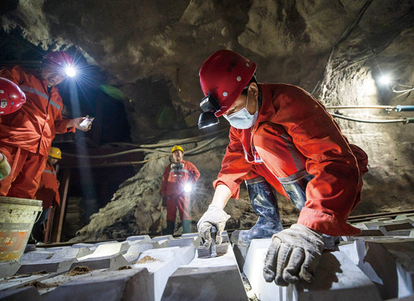 圖為馬鋼礦業張莊礦工人正在井下負480米處組裝無人機車零部件。