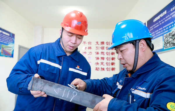 圖為八鋼軋鋼廠新產品研發技術團隊成員正在查看新產品外觀質量。