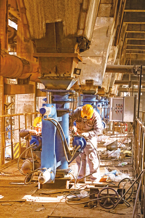 圖為檢修人員安裝智能電液雙層卸灰閥,改造後可消除可見粉塵泄漏點和漏風點。