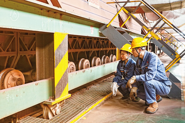 圖為該事業部職工在巡查,觀察整改後的燒結機台車滑道是否漏風。