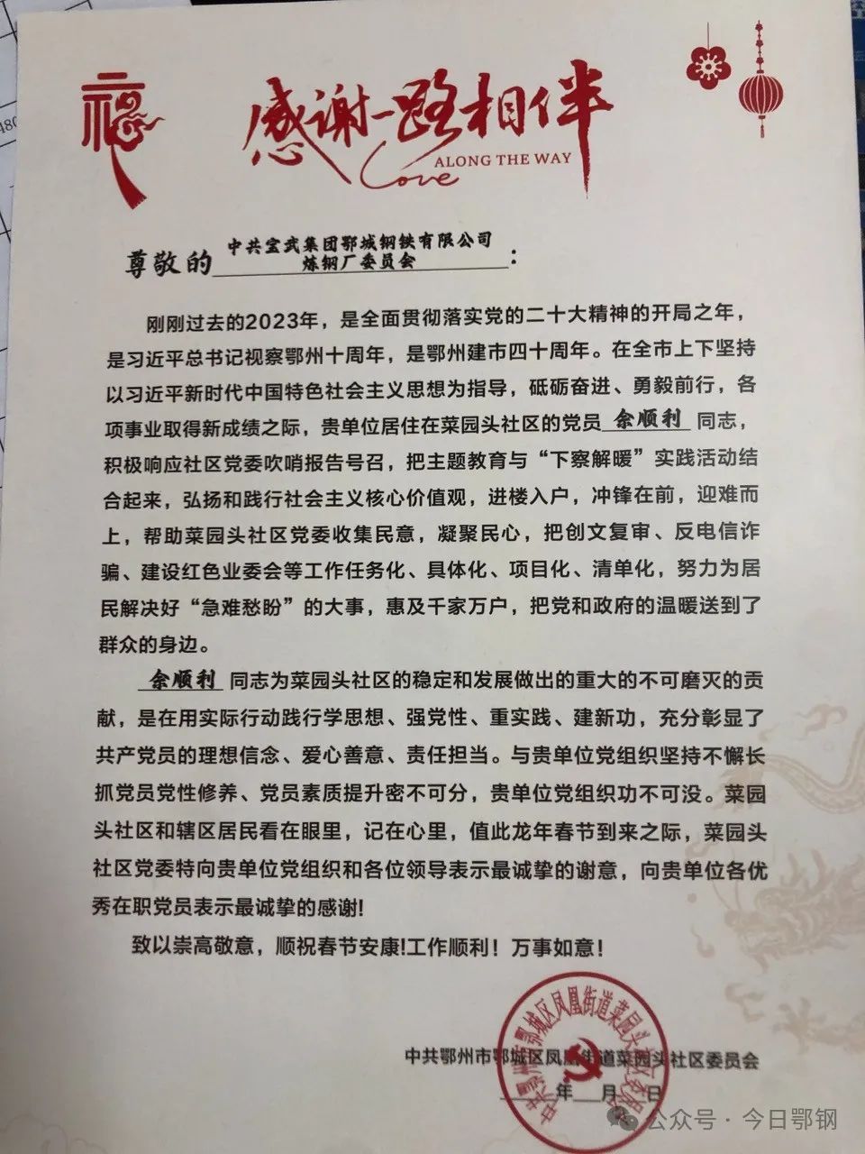 近期,鄂鋼多名職工收到了來自鄂城區鳳凰街道菜園頭社區的感謝信,對他們為菜園頭社she區qu做zuo出chu的de貢gong獻xian給gei予yu肯ken定ding和he感gan謝xie。平ping淡dan而er堅jian實shi的de行xing動dong,彰zhang顯xian著zhe央yang企qi員yuan工gong的de家jia國guo情qing懷huai和he責ze任ren擔dan當dang。發fa生sheng了le什shen麼me?讓rang我wo們men一yi起qi走zou進jin他ta們men的de故gu事shi。