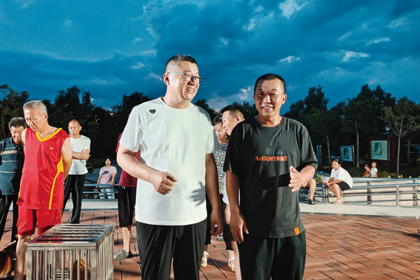 圖為宋洪猛和蘇斌芳下班後到單位附近的廣場上排練。