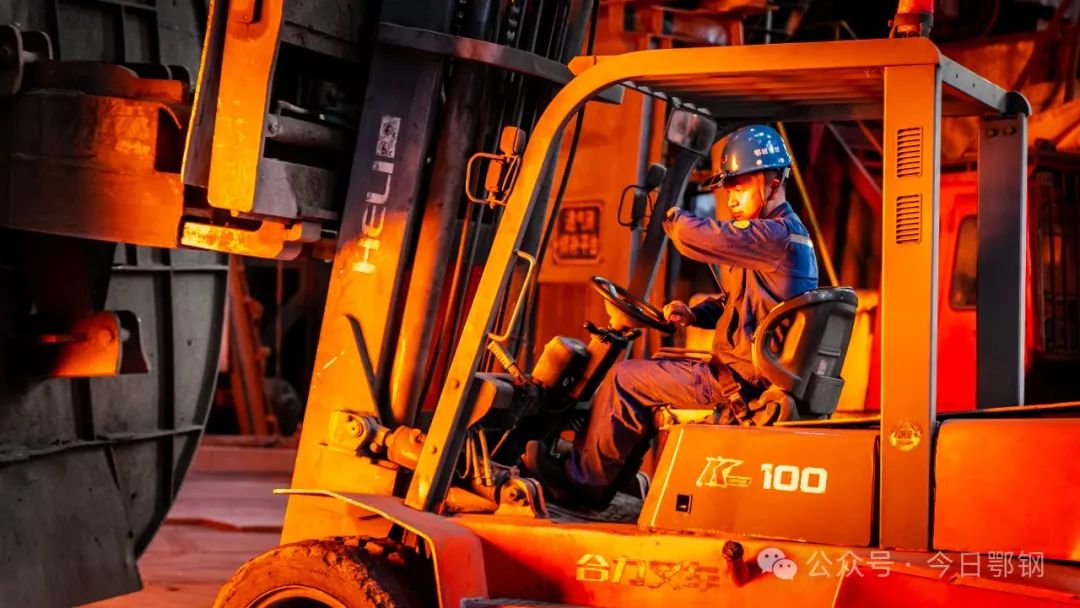鋼軋廠準備車間職工姚浩在駕駛叉車裝卸鋼包蓋。(桂多 攝)