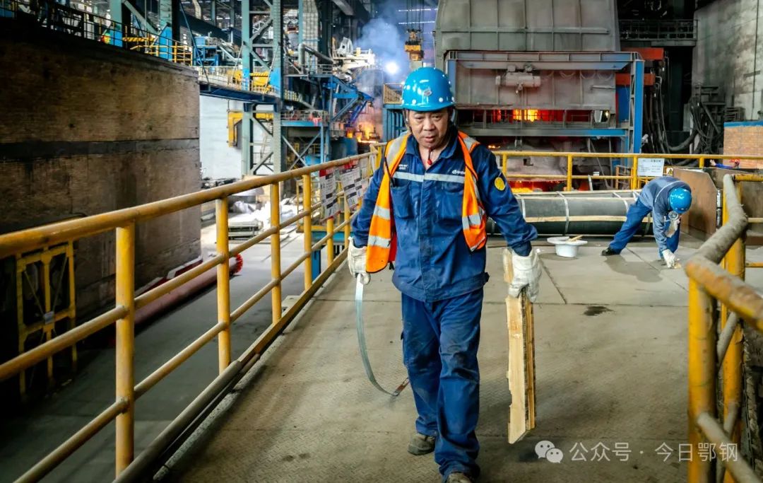 鋼軋廠煉鋼車間職工徐豔民在清理爐台雜物 。(桂多 攝)