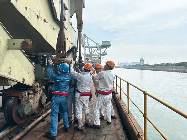圖為湛江鋼鐵職工在加固碼頭吊機。