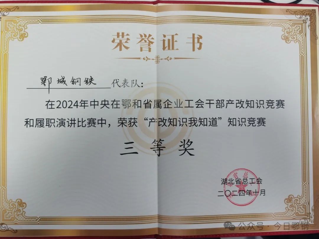 喜訊!鄂鋼榮獲省總工會產改知識競賽三等獎