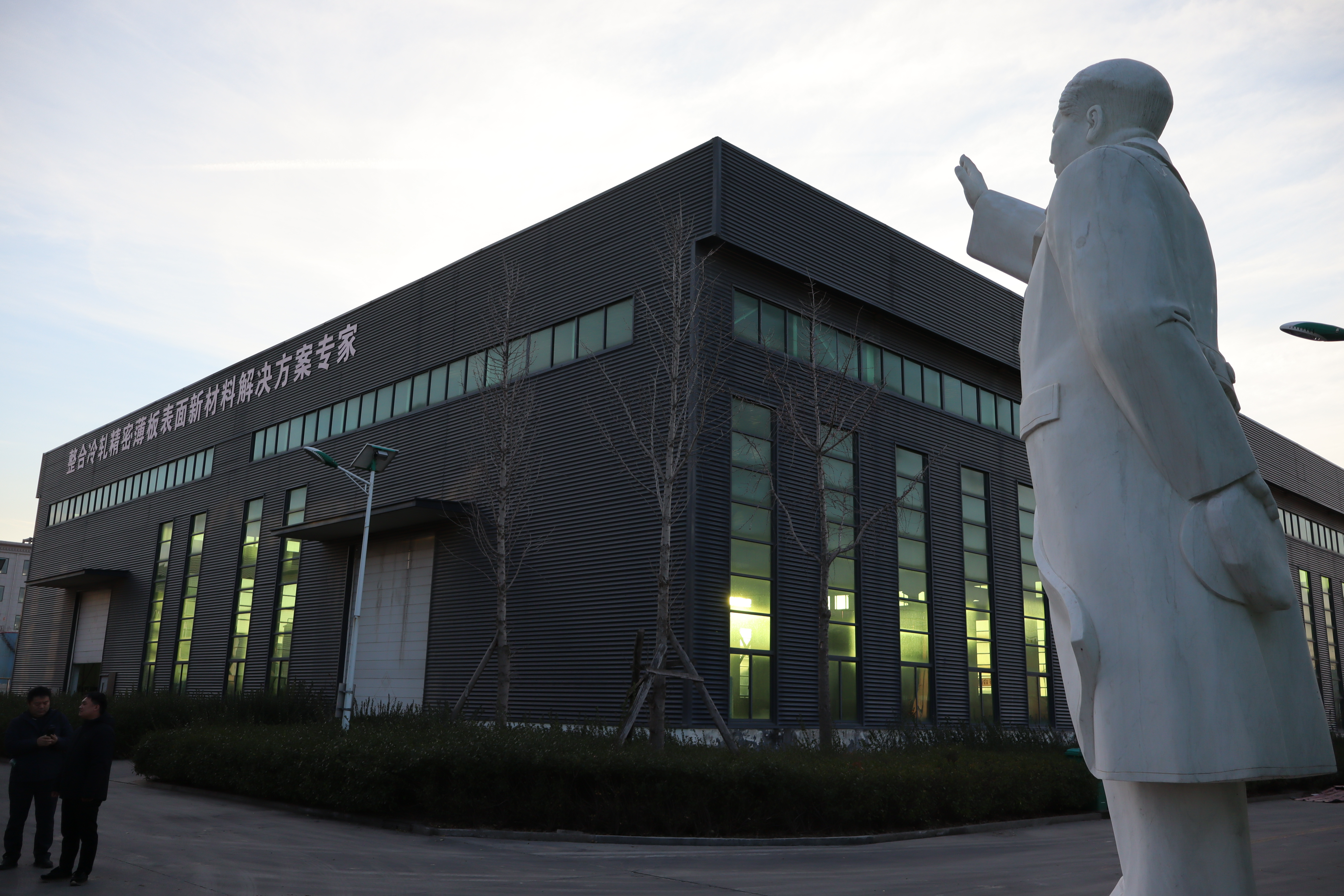 在華潤化工辦公樓的隔壁就是滄州華潤新材料生產區。走進廠區的大門,一眼便能望見大道另一端矗立著的 3 米高的毛主席塑像。毛主席腳下的紅色瓷磚上刻有金色的“隻爭朝夕 不負韶華”8個大字。