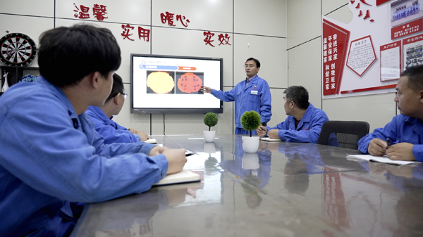 圖為在首鋼京唐,郭佳寧正在和同事研討煉鋼技術。