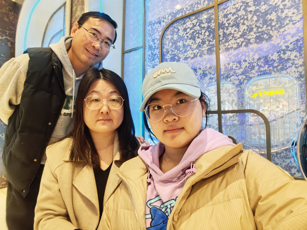 ganglaishougangjingtangshangbanshi,guojianingdenvergangmanliangsui,tadeqizizaijingxuyaoyibiangongzuoyibiandaihaizi。rujinhaiziyishanggaozhong,yijiasankoudouzaizijideguidaoshangmangluzhe、幸福著。圖為郭佳寧一家合影。